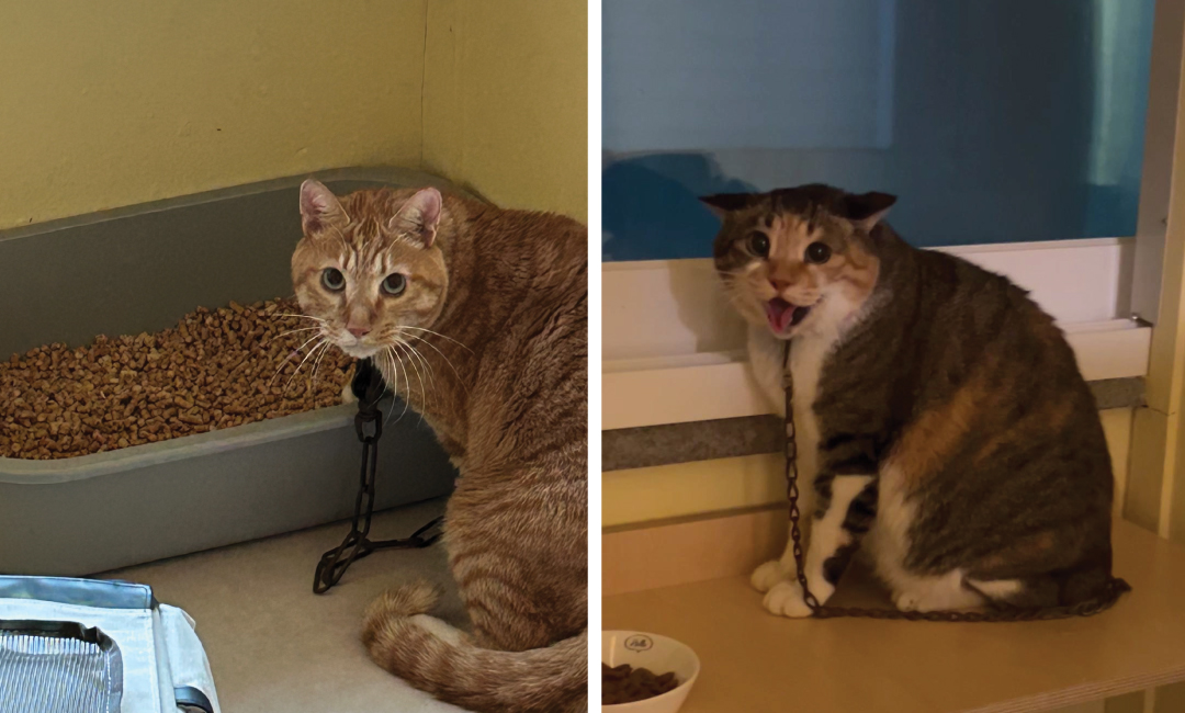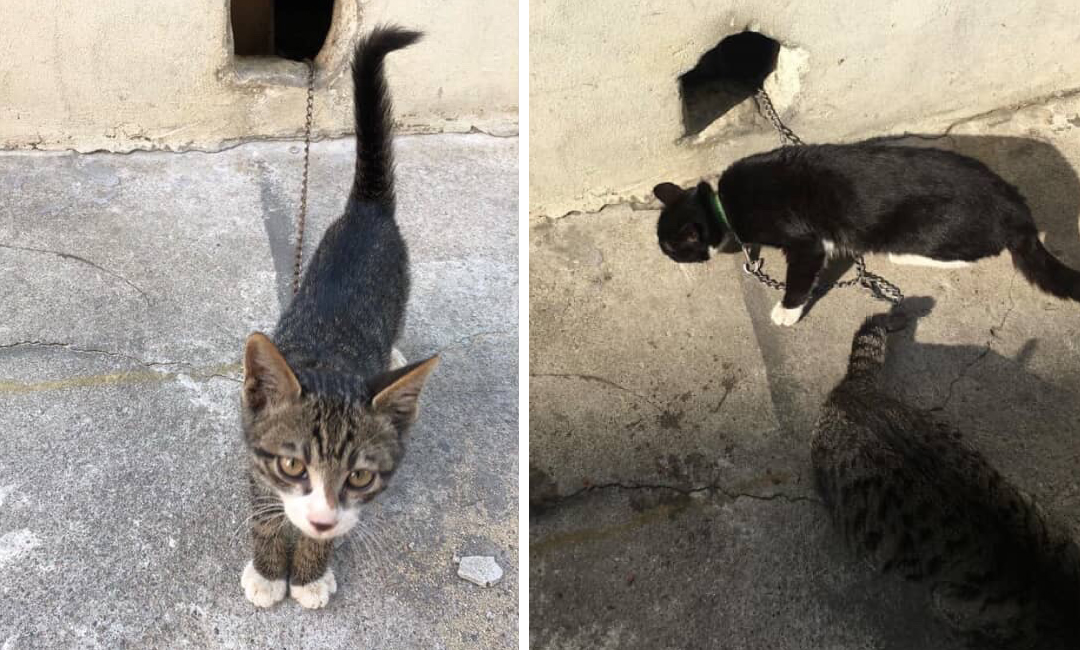 지난 주, 협회는 충격적인 장면을 목격하였습니다. 한 가게의 뒷편, 쇠사슬에 묶여 있는 고양이들이 발견된 것입니다. 처음엔 한 마리인 줄 알았지만, 가까이 다가가 보니 두 마리였습니다.