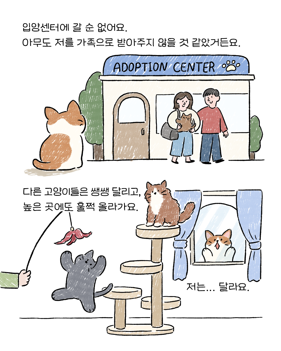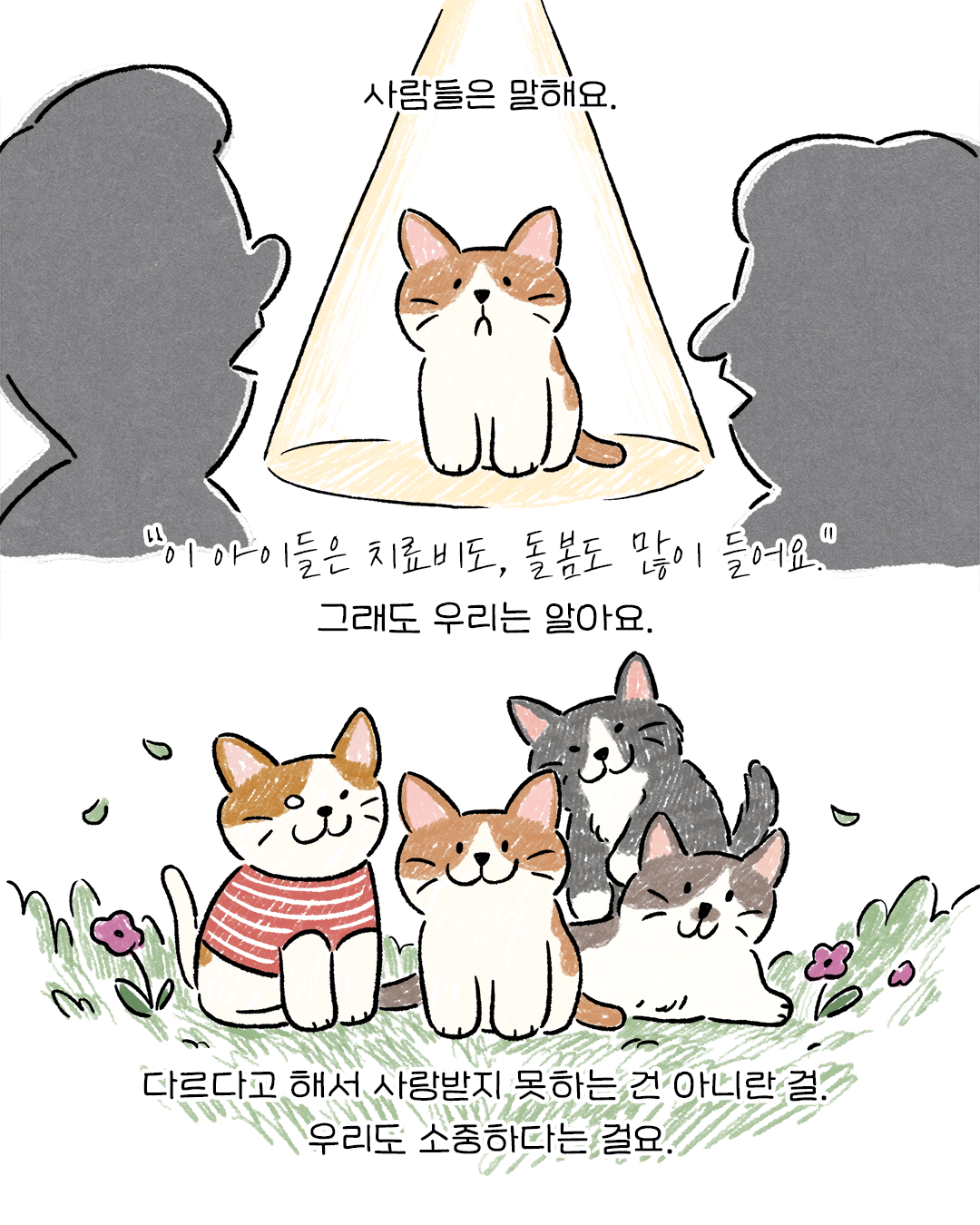 이처럼 장애가 있거나 몸이 아픈 친구들은 고양이들 사이에서도 쉽게 어울리지 못하고 적응을 어려워하는 경우가 많습니다. 하지만 쉼터에서는 모두가 다르고, 그래서 모두가 특별합니다. 아이들은 서로에게 의지하며, 오늘도 각자의 속도로 살아내고 있습니다.